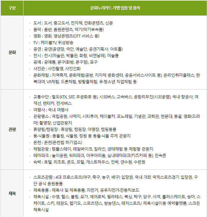 - 사용처: 공연, 영화, 전시 관람, 국내 여행, 4대 프로스포츠 관람(축구, 농구, 야구, 배구) 등 다양한 분야에서 사용 가능합니다.