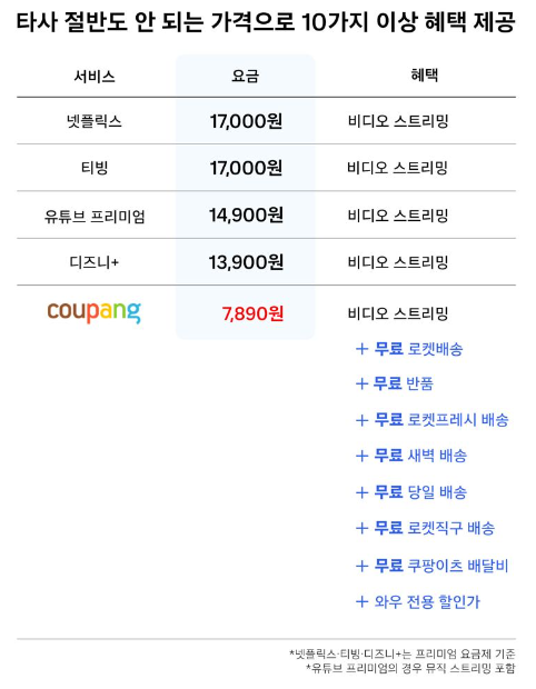 국내외 유명 유통업체들과의 비교에서도 쿠팡 와우 멤버십은 경쟁력 있는 가격대를 유지하고 있습니다.