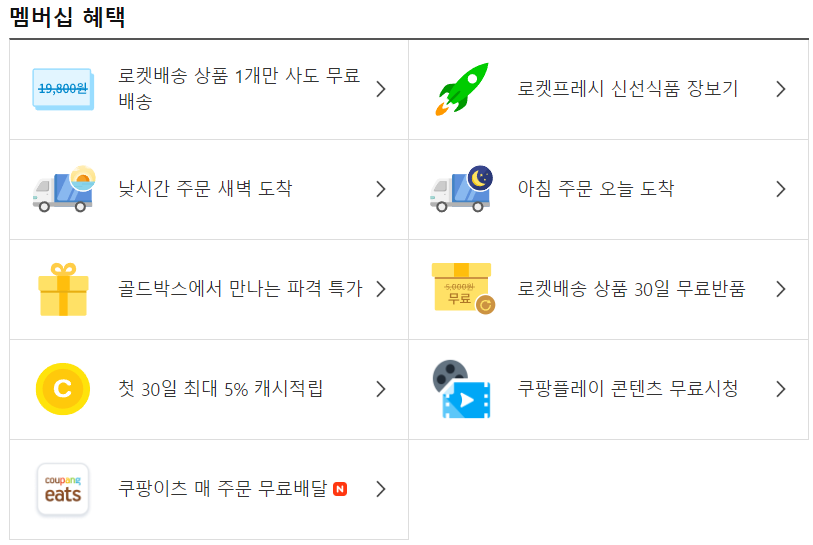 위의 혜택 이외에도 멤버십은 로켓배송, 새벽 배송, 쿠팡플레이 시청, 쿠팡이츠 무료배달 등 10가지 이상의 혜택을 제공하여 월평균 8만원, 연평균 100만원의 할인 혜택을 주고 있습니다.