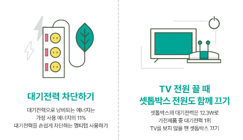 - 사용하지 않을 때는 냉난방기와 TV 셋탑박스 전원을 꺼주세요. 특히 셋탑박스는 대기 전력 소비가 크므로 사용 후에는 플러그를 뽑는 것이 좋습니다.