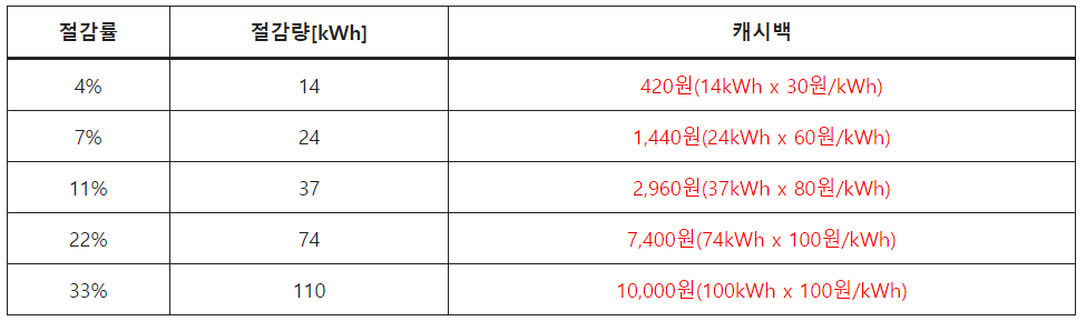 이 프로그램은 전기 사용량을 줄인 가정에게 절감된 전력량에 비례하여 최대 30% 한도 내에서 캐시백을 제공하며, 이를 통해 전기요금도 절약하고 추가 혜택을 받을 수 있습니다.