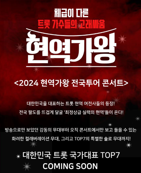 이제 여러분의 차례에요. 콘서트에서 여러분을 만날 수 있기를 기대하며, '현역가왕 전국투어 콘서트'에서의 뜨거운 열기와 감동을 함께 나눌 준비를 해보세요. 음악으로 하나 되는 그 순간을 기대하며, 콘서트에서 만나요!