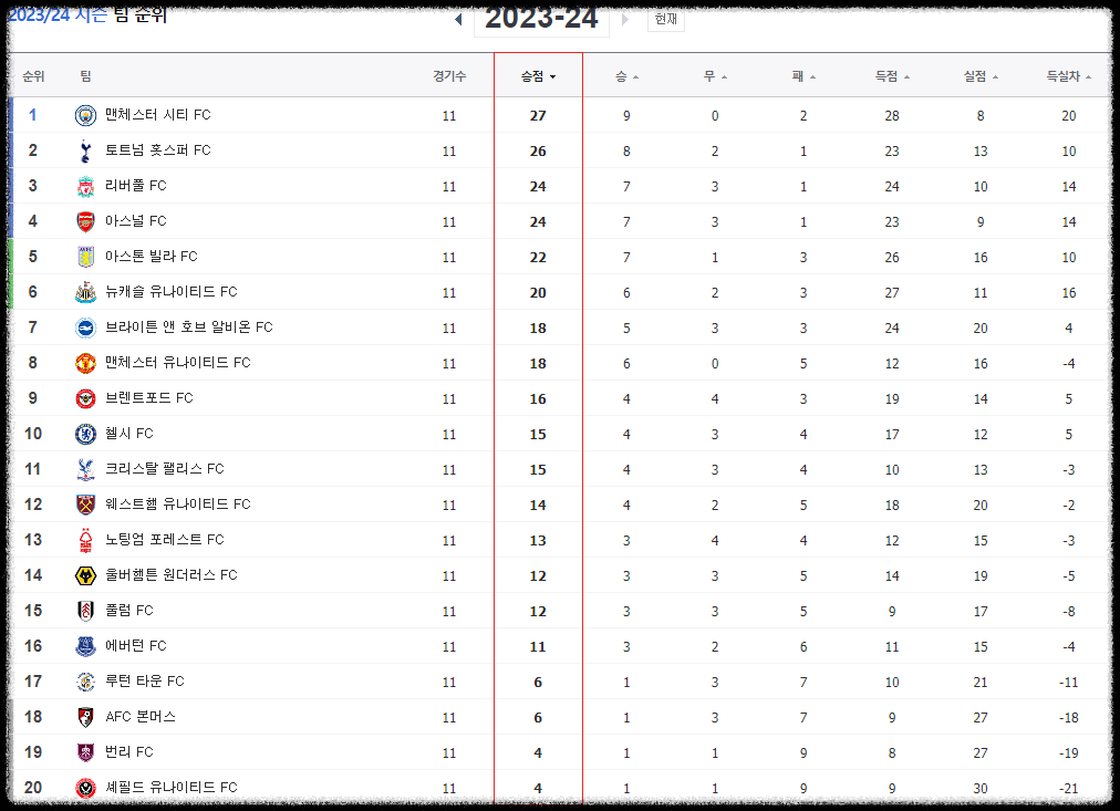 지금 현재 2023/24 시즌에는 승점 24점으로 4위를 차지하고 있습니다.