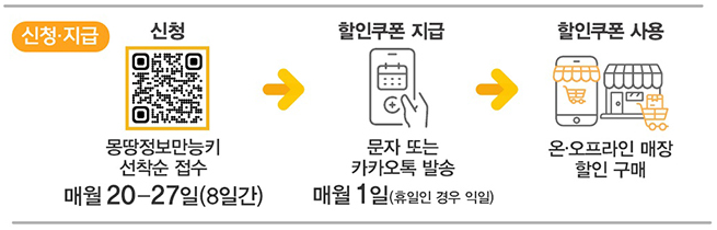 - 신청기간 : 매달 20일~27일까지 선착순 접수(쿠폰 발송일은 신청월 다음달 1일, 휴일일 경우 다음날)