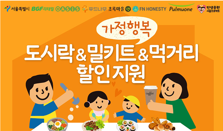 서울시에서는 바쁜 일상 속에서 가족과 함께하는 시간을 더 가치있게 만들고자 '가정행복 도시락·밀키트·먹거리 할인지원 사업'을 운영하고 있어요. 지난 2022년 10월 ‘퇴근길 가정행복 도시락・밀키트 할인지원’이라는 이름으로 시작한 이 사업은 18세 이하 자녀 양육가정이 도시락, 밀키트, 신선식품 등을 20% 내외로 할인된 가격에 구매할 수 있도록 지원하는 사업이에요.