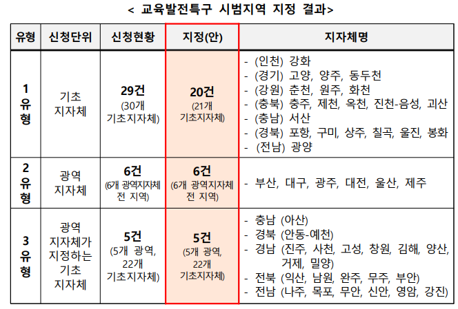 교육발전특구 시범지역 선정 과정은 지역 교육의 질을 높이고, 교육 혁신을 이끌어내기 위한 매우 중요한 단계였습니다. 이 과정은 전국의 여러 지역들이 참여해 경쟁적으로 이루어졌고, 각 지역은 자신들만의 독특한 교육 프로그램과 혁신 계획을 제출했습니다. 선정 결과, 다양한 교육적 요구와 지역적 특성을 반영한 31개의 시범지역이 발표되었습니다. 이들 지역은 앞으로 정부로부터 재정적 지원과 정책적 우대를 받게 되며, 이를 바탕으로 지역 맞춤형 교육 혁신을 실현할 기회를 얻게 되었습니다.