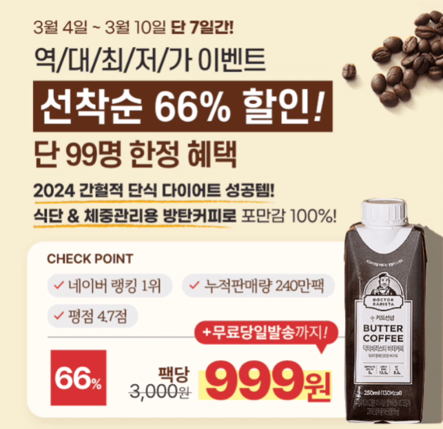 Q.[선착순 99명] 다이어트 성공템 닥터바리스타 선착순 66% 할인, 역대최저가 팩당 999원! (* 선착순 마감 시 종료)