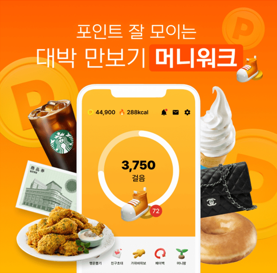Q. O OO OOO 머니워크는 걸음수 5000보에 200포인트를 기본으로 드립니다. 여기에 함께 걷기, 친구 초대 같은 기능을 이용하면 하루에 1000포인트 모으는 것도 쉬워요. 5일이면 상품 교환활 수 있습니다.