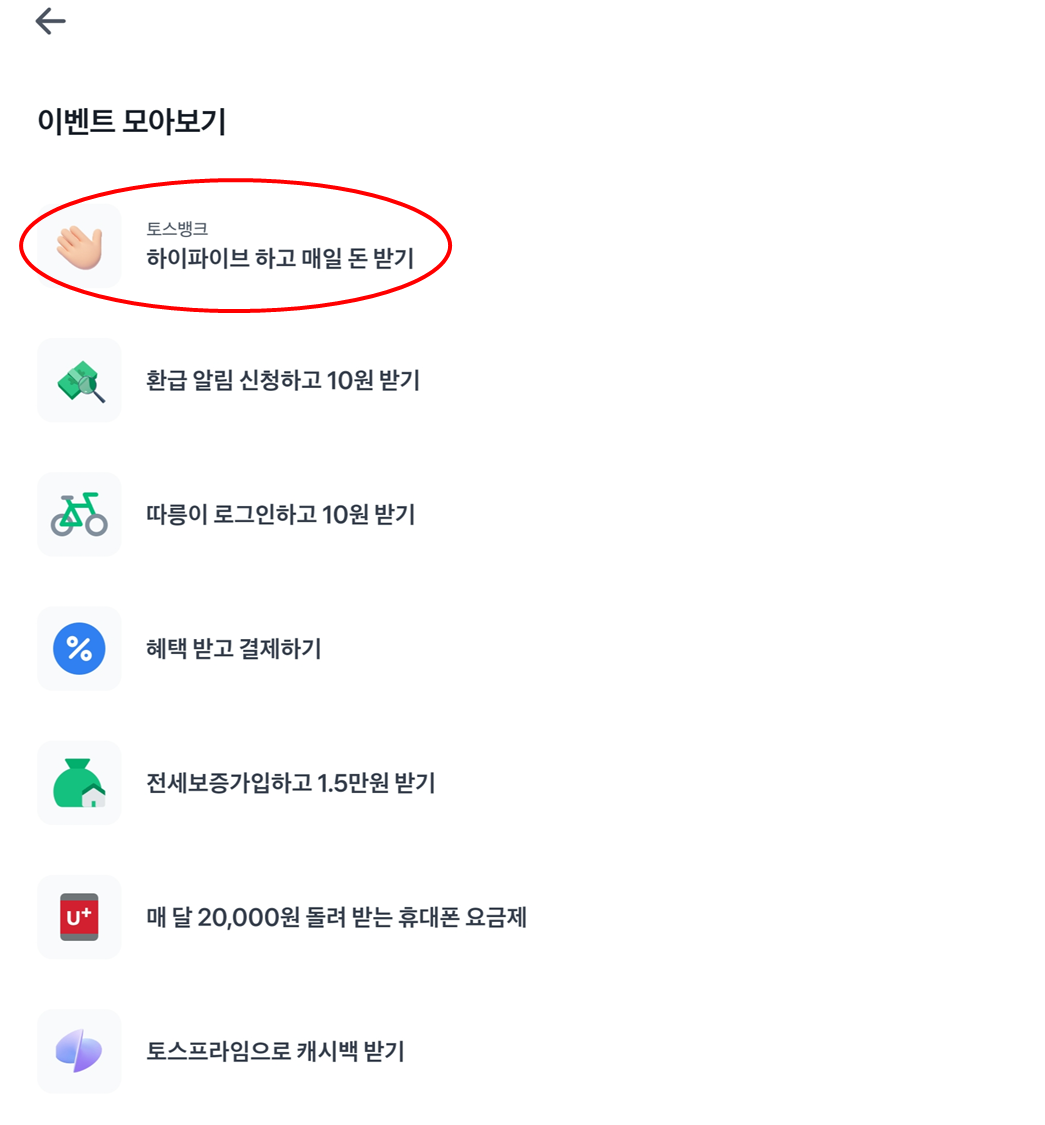 - 이벤트명 : 토스 하이파이브 하고 매일 돈 받기