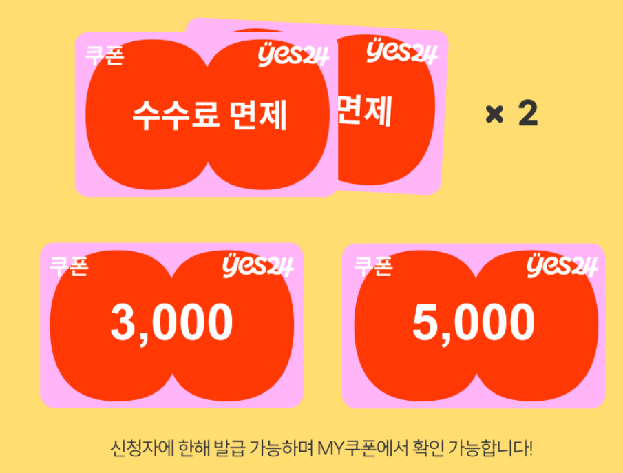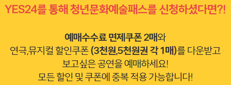 - ✅ YES24 신청 추가혜택 : 예매수수료 면제쿠폰 2매와 연극, 뮤지컬 할인쿠폰(3천원, 5천원권 각 1매) 제공