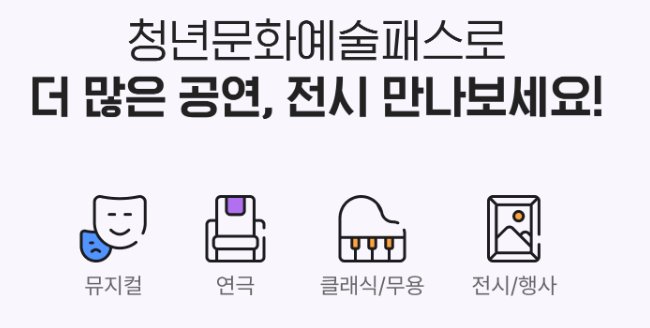 청년문화예술패스란 사회에 첫 발을 내딛는 대한민국 19세 청년에서 공연(연극, 뮤지컬, 클래식 등) 전시 관람비를 지원하여 청년의 문화향유 기회를 제공하고 예술창작활동에 대한 간접적 지원과 무노하예술시장 활성화를 목적으로 하는 사업입니다.