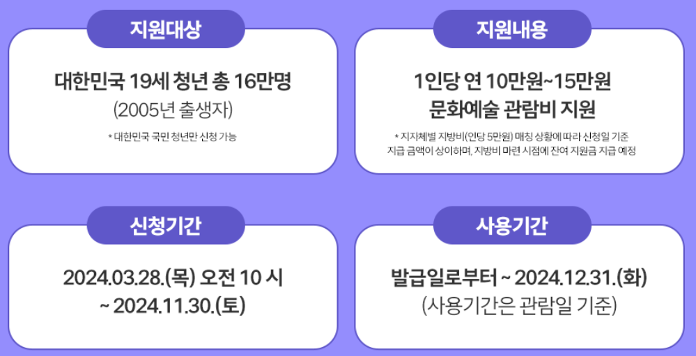 - 청년문화예술패스 지원대상 : 대한민국 19세 청년 총 16만명(2005년 출생자)